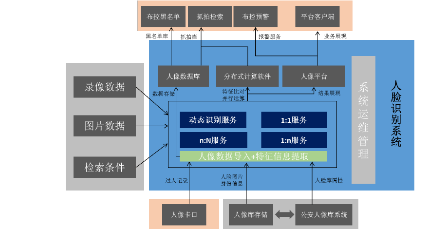 系统由人像卡口、人脸识别服务器、人脸识别平台、存储设备、人像大数据系统五款产品组成。