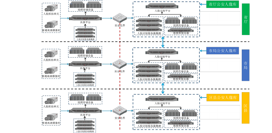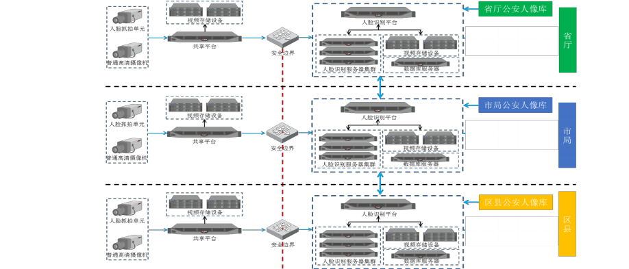 在公安网中部署人脸识别系统,前端人脸卡口通过共享平台传输视频至公安网.公安网下人脸识别平台对接共享平台获取前端数据,导入识别服务器进行特征提取和识别比对,并通过人像大数据平台进行业务分析,数据挖掘等工作。