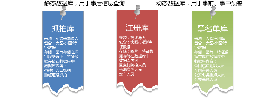 黑名单库-包含高危人员、特殊人员的人脸图片、结构化的人脸特征数据和人员身份信息,主要的应用场景是在各个人脸卡口进行实时人流的人脸比对预警。一般来说人脸抓拍库和人脸注册库做为静态库,适用于事后查询检索目标、黑