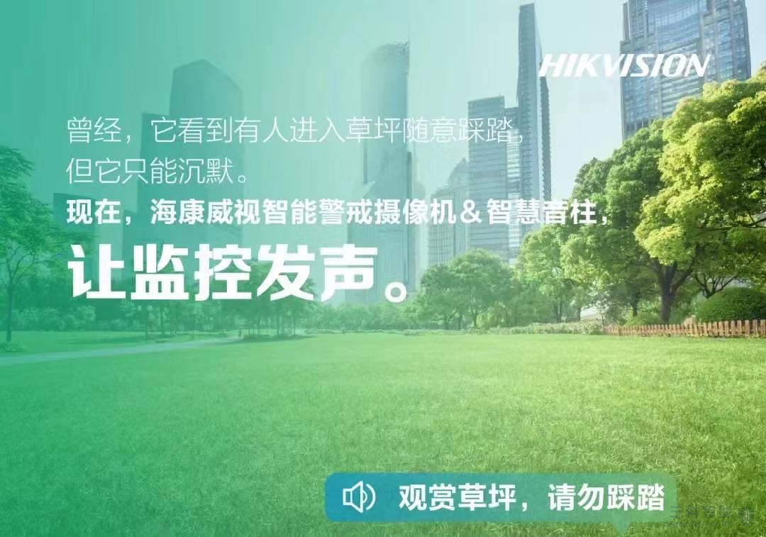 在小区观赏草坪的散步道附近安装海康威视智能警戒摄像机,进行提示喊话“绿色草坪,请勿踩踏”,让违规的人意识要问题的严重性。